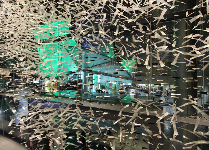 至於想一窺泰國開放的設計語彙與材質運用的廣度,在Siam Center一覽無遺。每一個入口處的材質都不同、每一個獨立櫃位的設計都不重覆,裡面運用的材質令人目不暇給,例如玻璃,從透明、霧面、烤漆、單層、雙層…,幾乎所有種類的玻璃藝術都可看到。更不會你用烤漆玻璃,我就用烤漆玻璃,全面性呈現多面向的設計層面,加上沒有放棄傳統手工製造法,讓泰國設計多一點獨特的手工感與人性化。其實走一趟Siam Center,就知道設計的廣度;設計要怎麼做,多觀察不是去模仿,而是可以從中觸發你的創意。不過,此次最大的收獲是可以跟2位泰國建築師的交流,透過彼此面對面的言談,才可以探討泰國設計文人中最深層的一面,比往再多設計飯店、看更商空,都來得有意義。