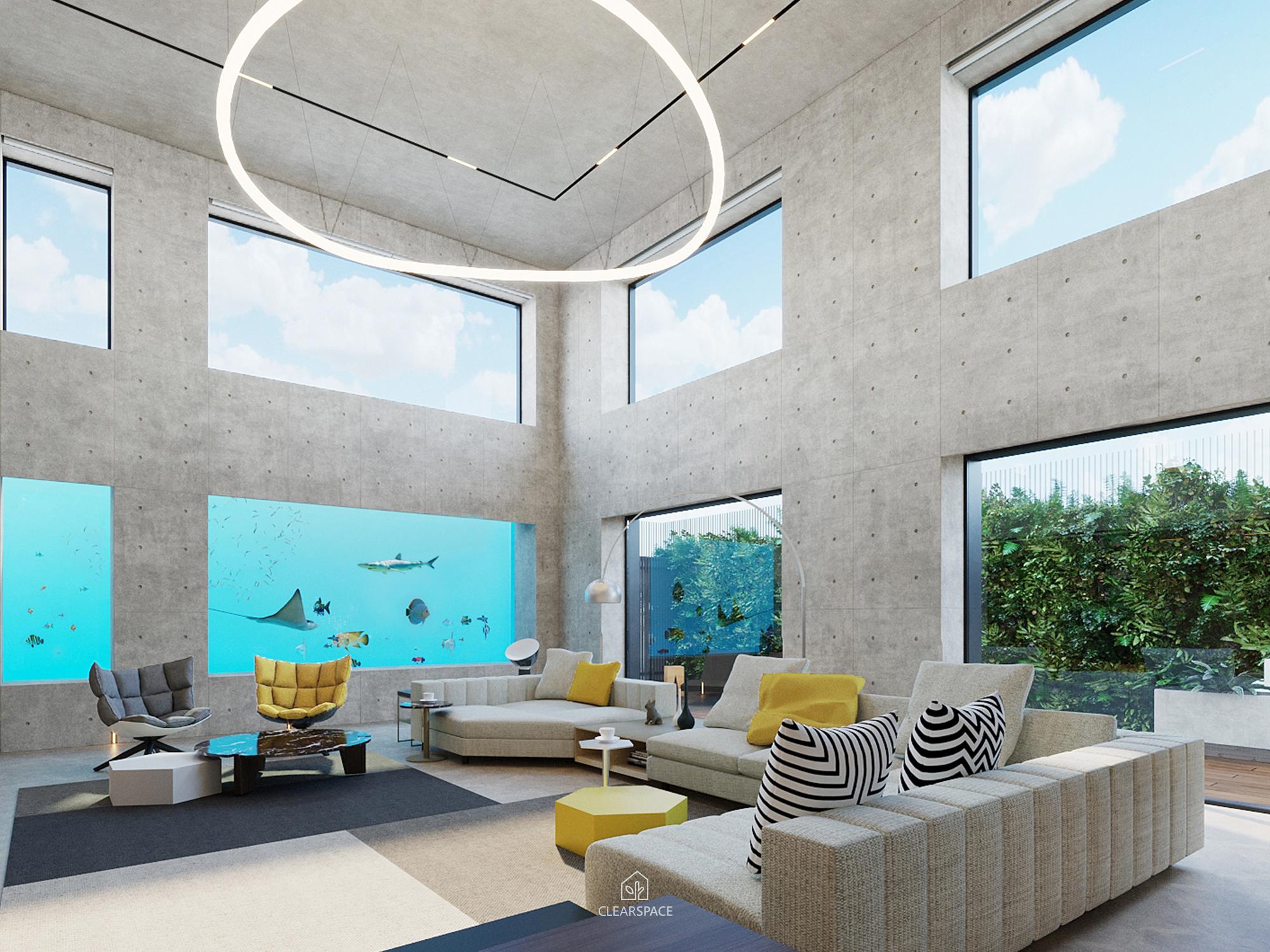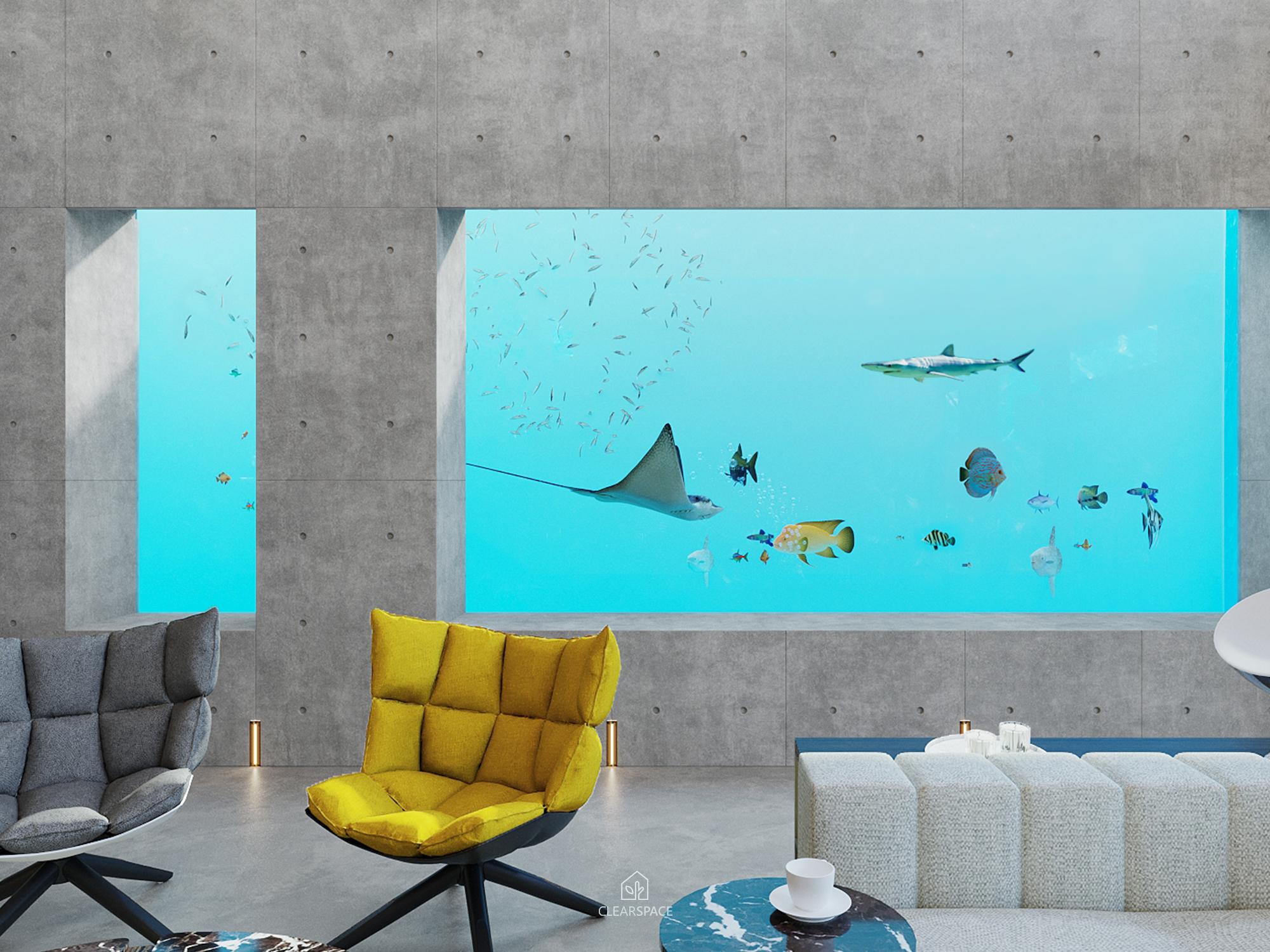 Eight expansive windows on the northwest unfold a poetic landscape, alongside a 25-cubic-meter seawater aquarium, creating a refractive spectacle. Active shading curtains choreograph sunlight, adding a dynamic play of shadows.