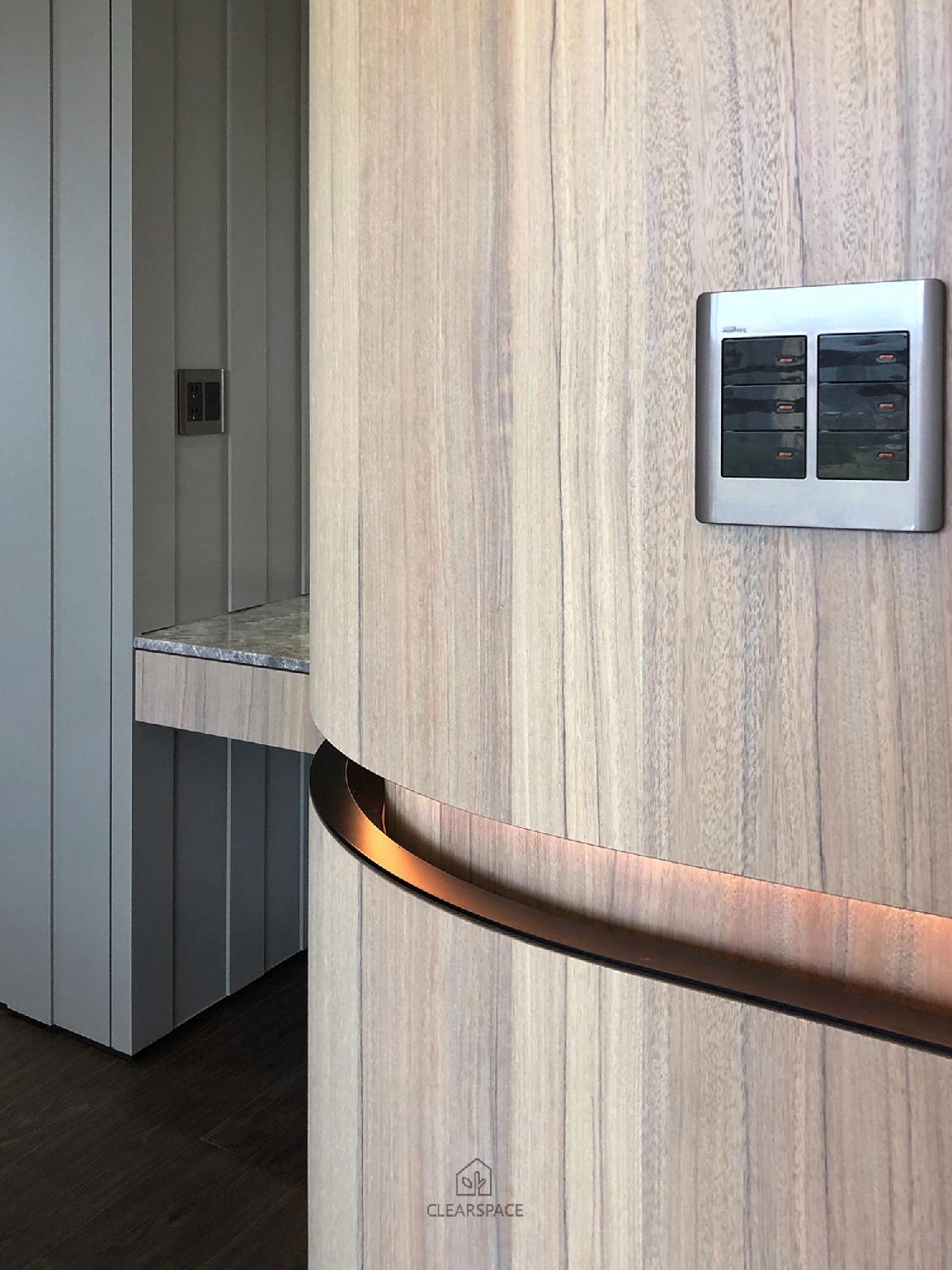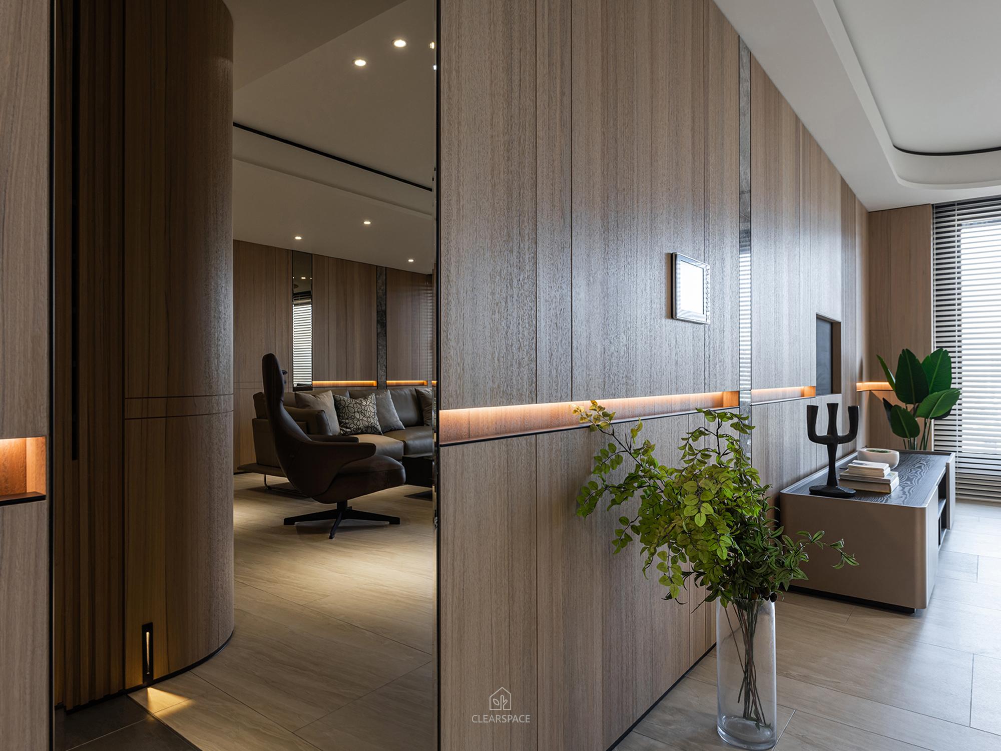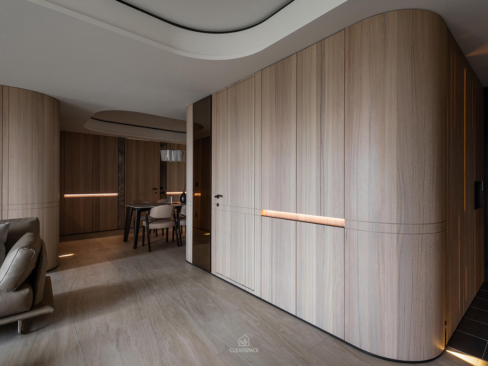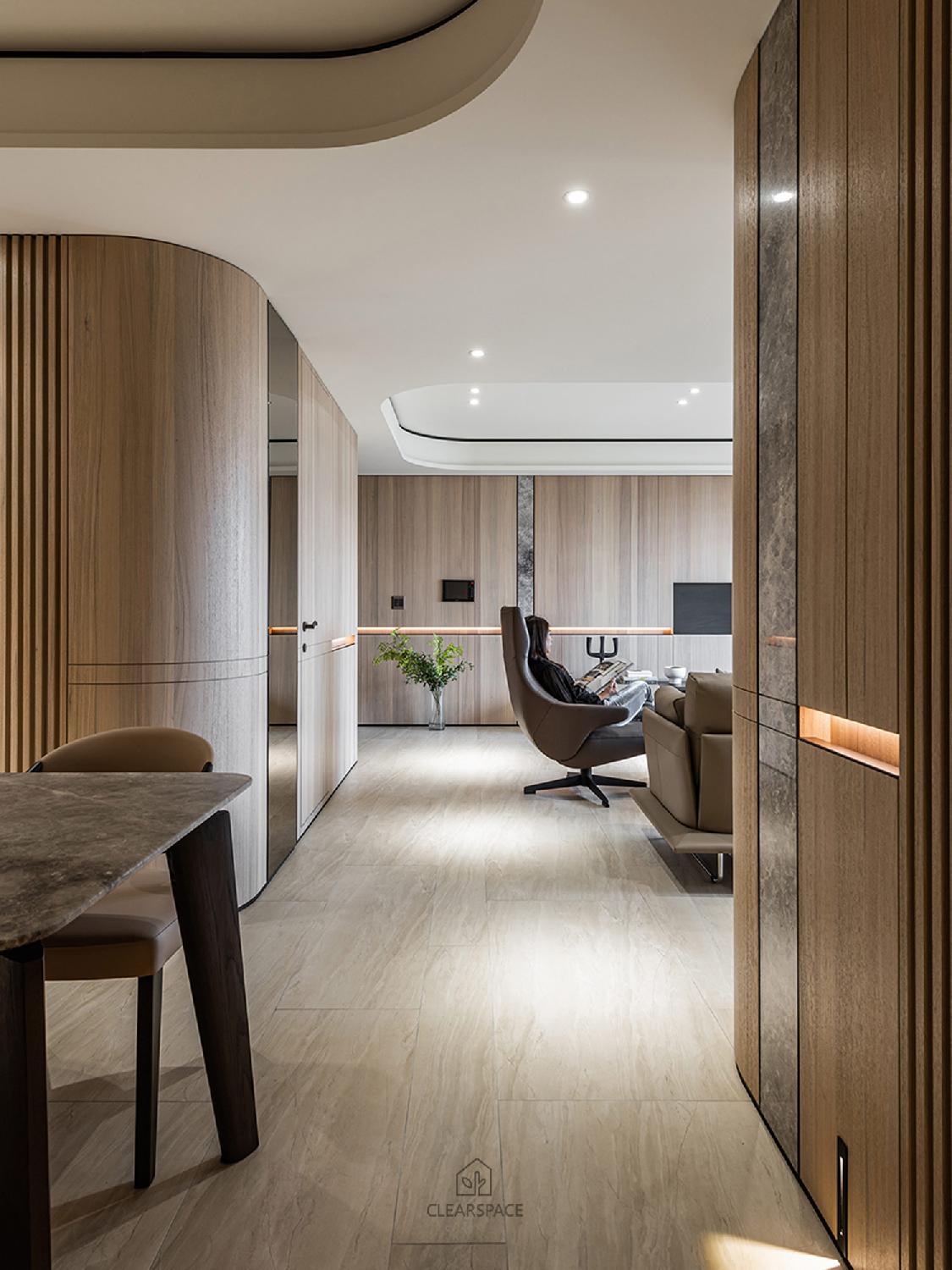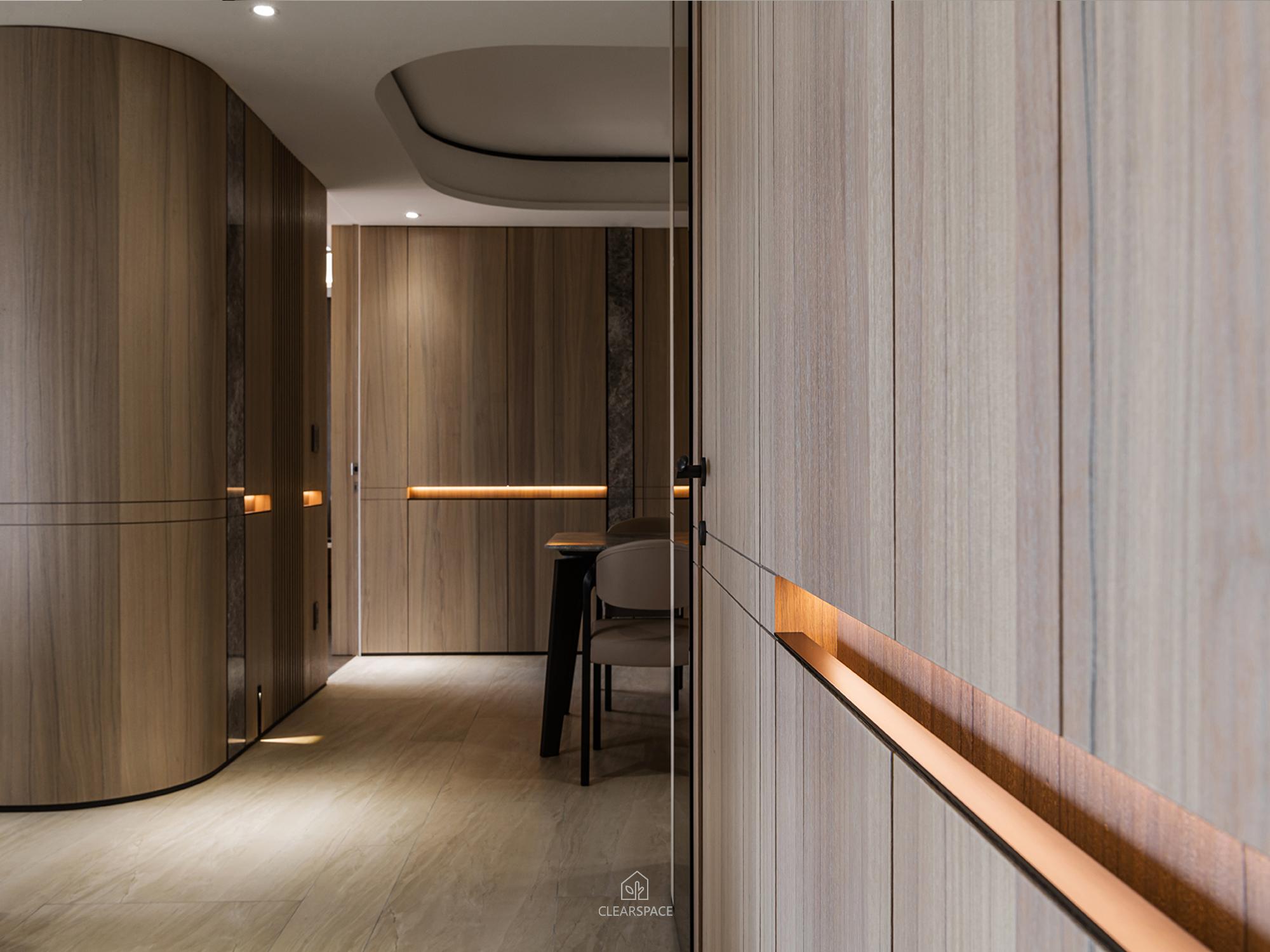 從入口至客餐廳、廚房、臥室、更衣室,全室及腰間接光燈帶+壁面隱藏堅固扶手,住家安全升級。全曲壁面收納櫃,美觀、機能、舒適又安全。