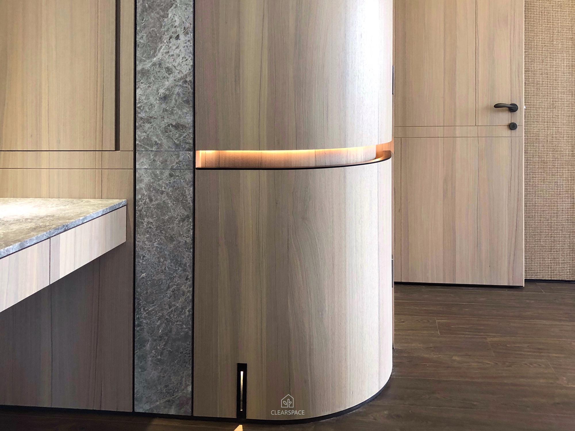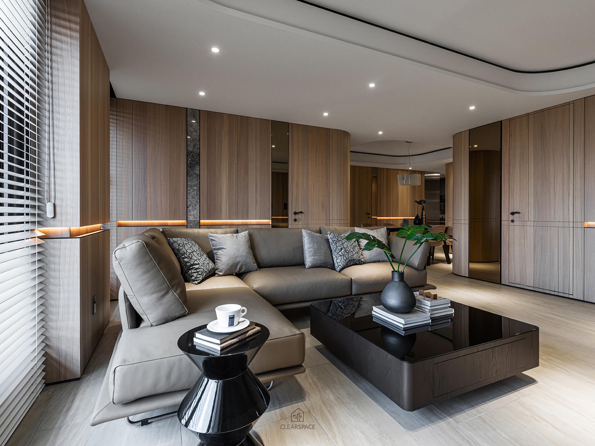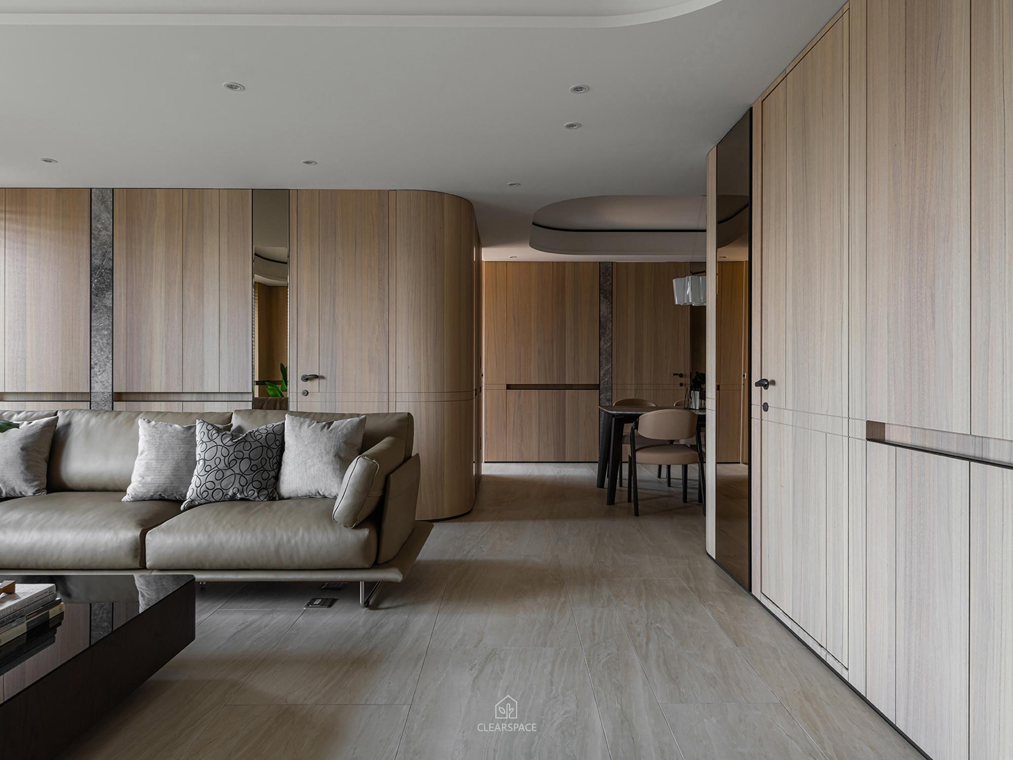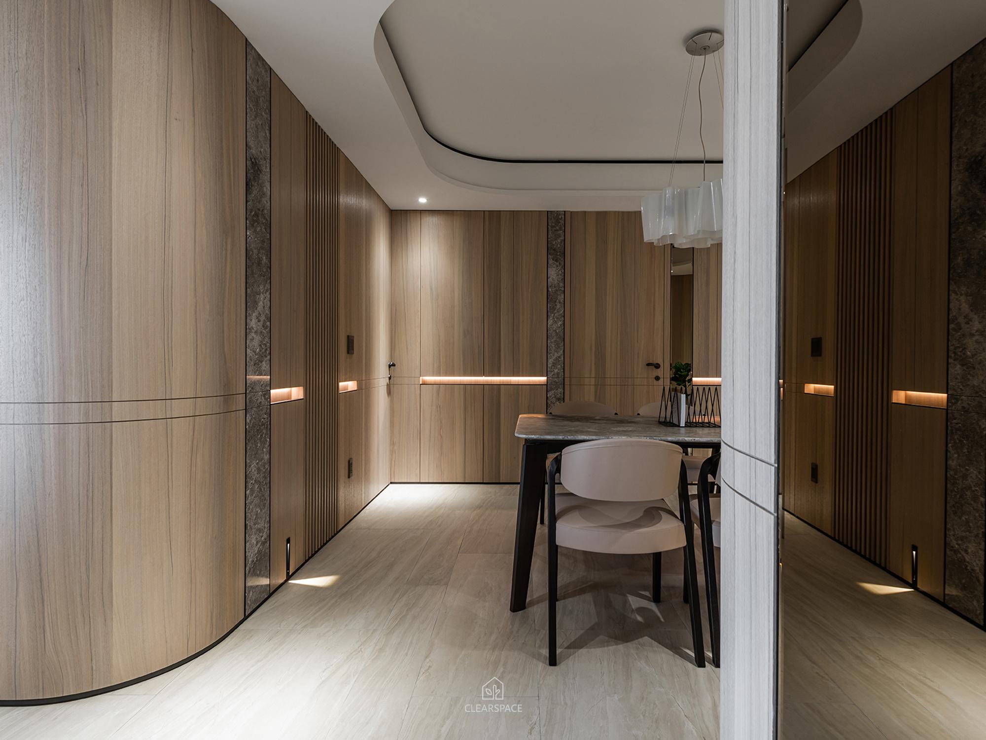 從入口至客餐廳、廚房、臥室、更衣室,全室及腰間接光燈帶+壁面隱藏堅固扶手,住家安全升級。全曲壁面收納櫃,美觀、機能、舒適又安全。