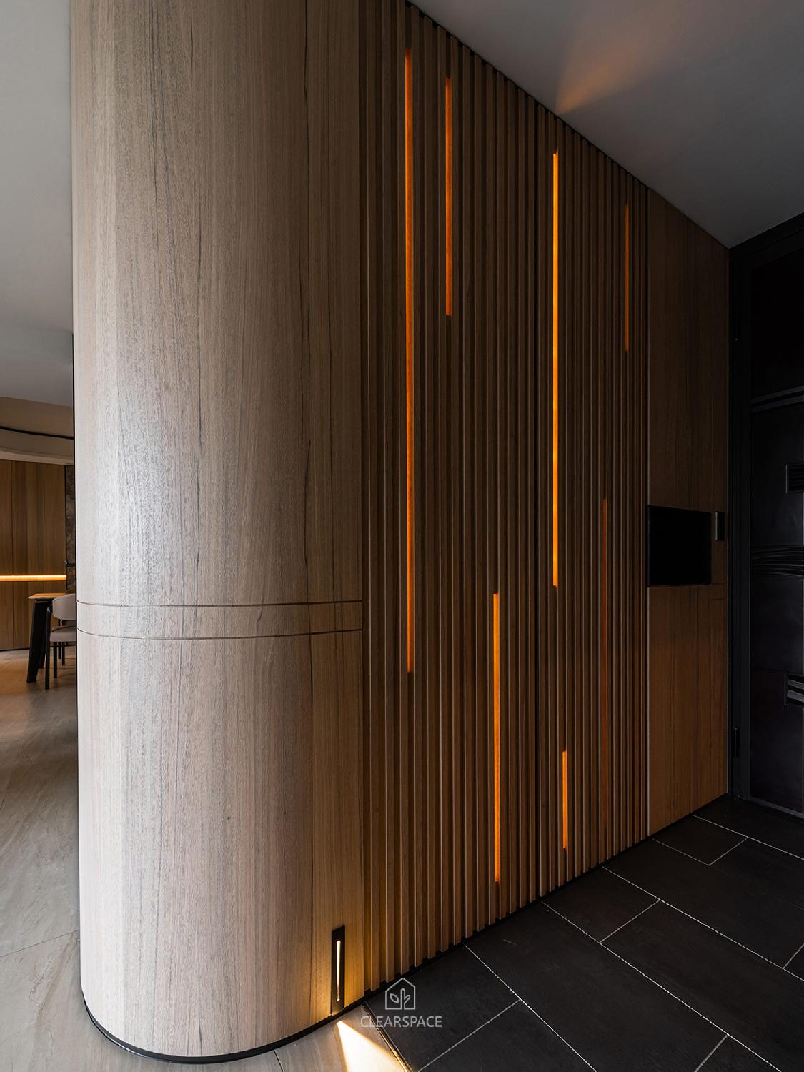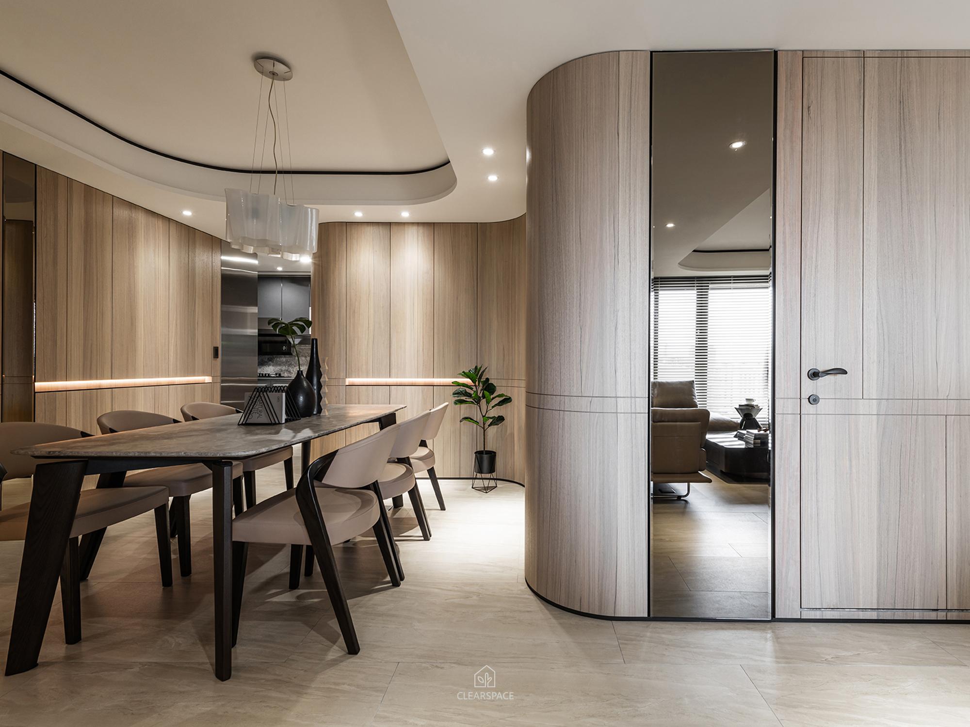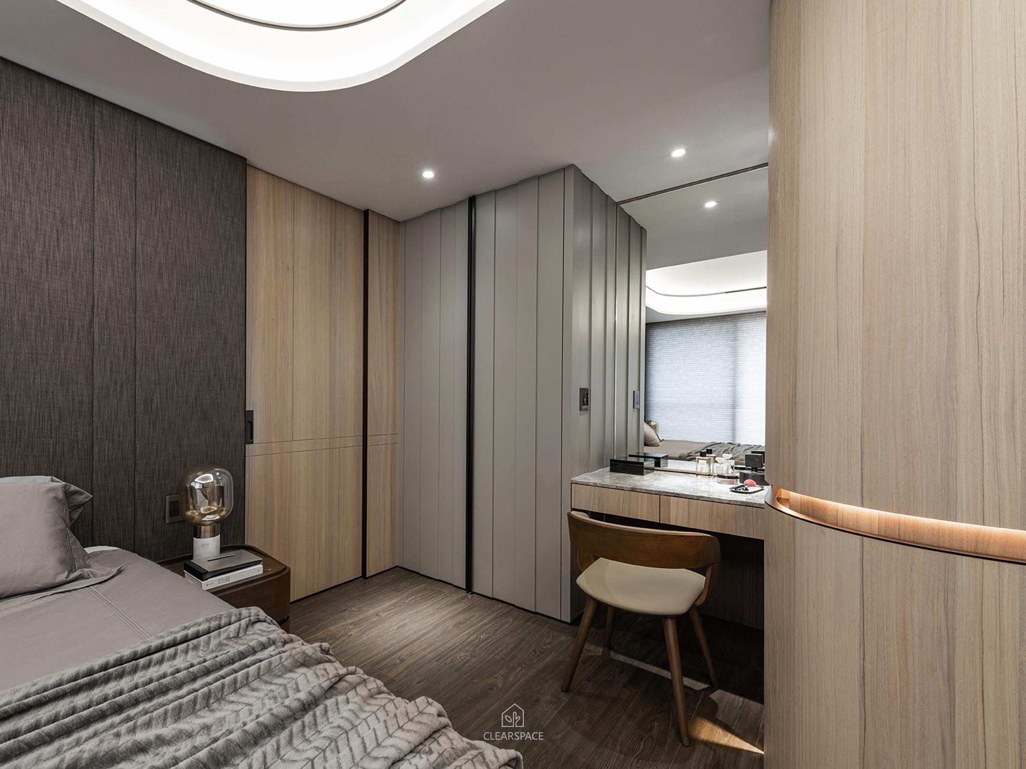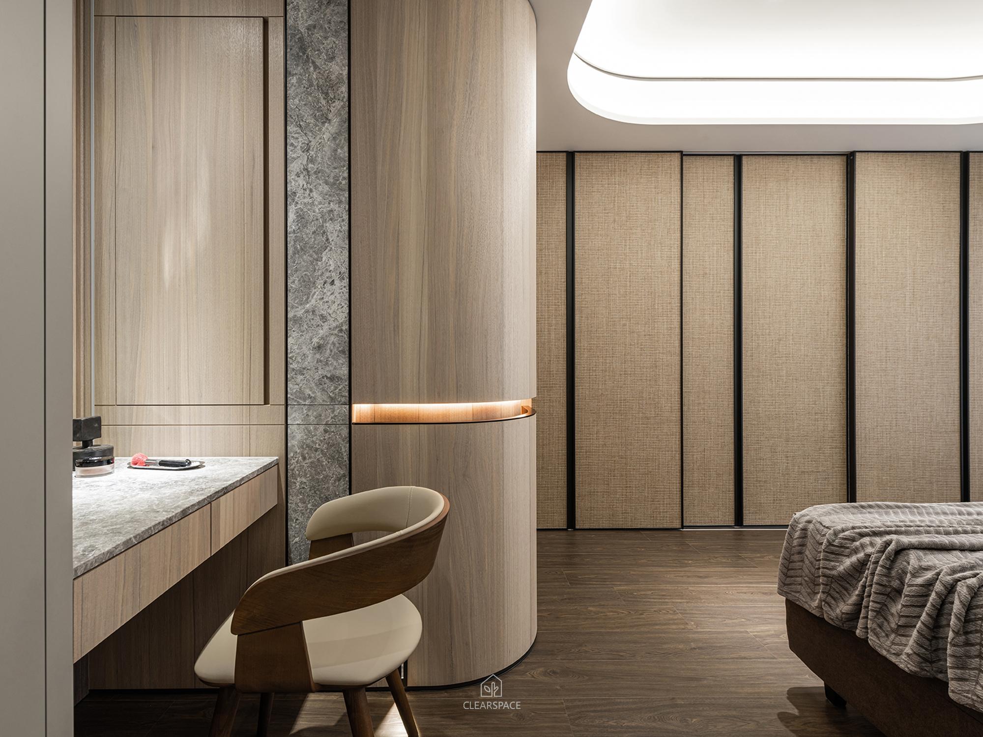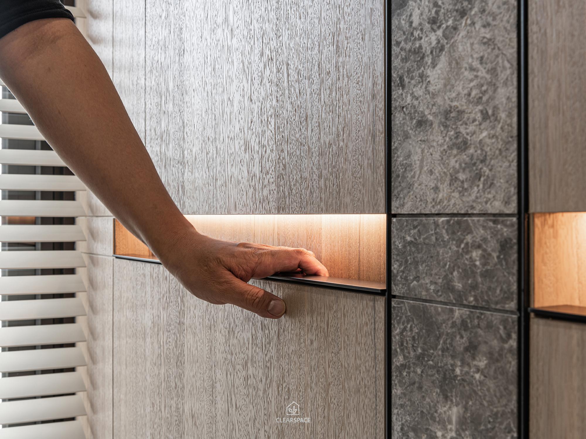 從入口至客餐廳、廚房、臥室、更衣室,全室及腰間接光燈帶+壁面隱藏堅固扶手,住家安全升級。全曲壁面收納櫃,美觀、機能、舒適又安全。