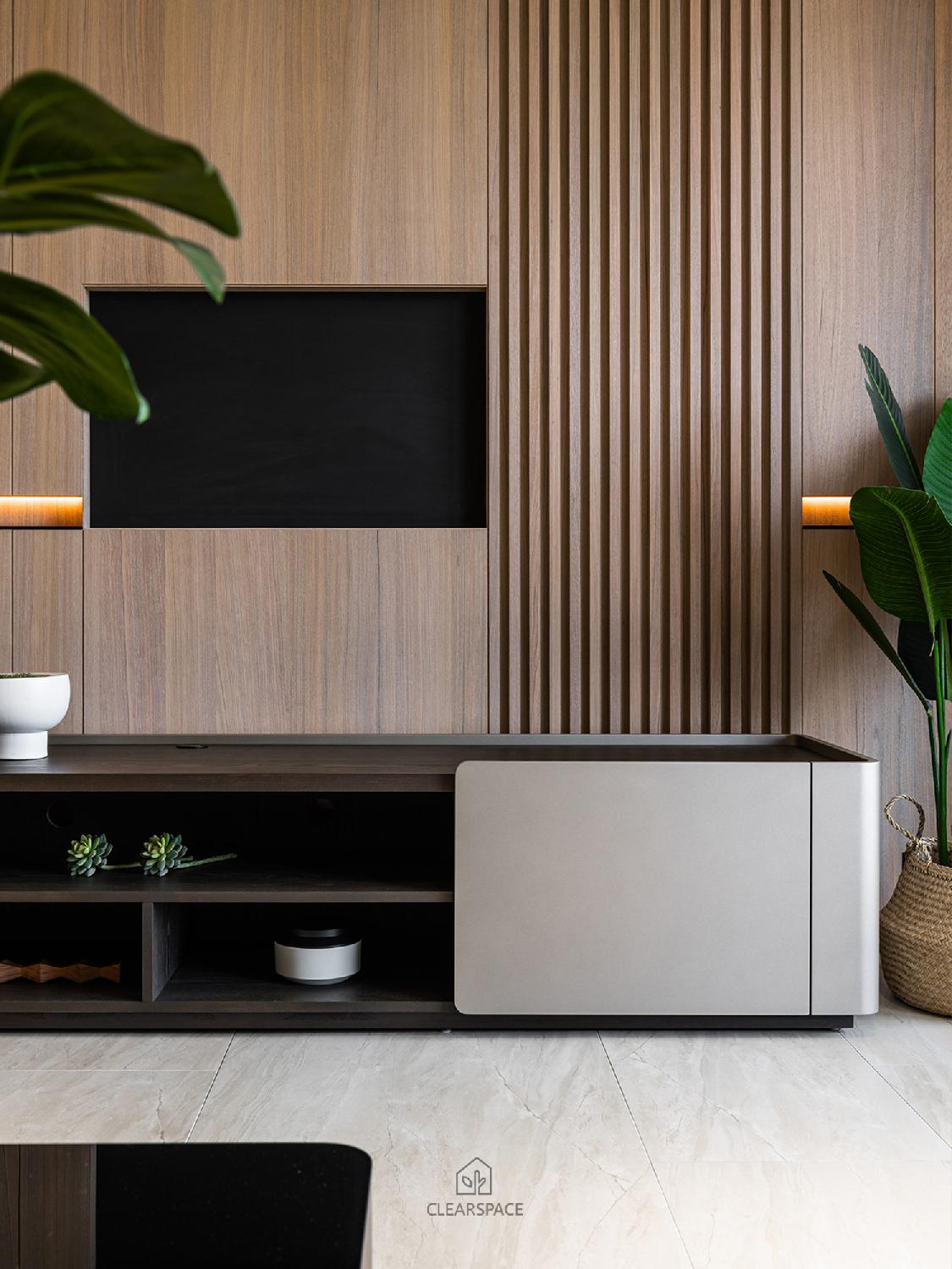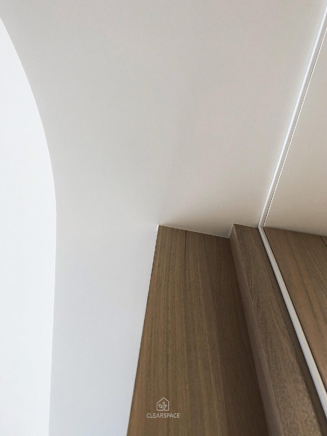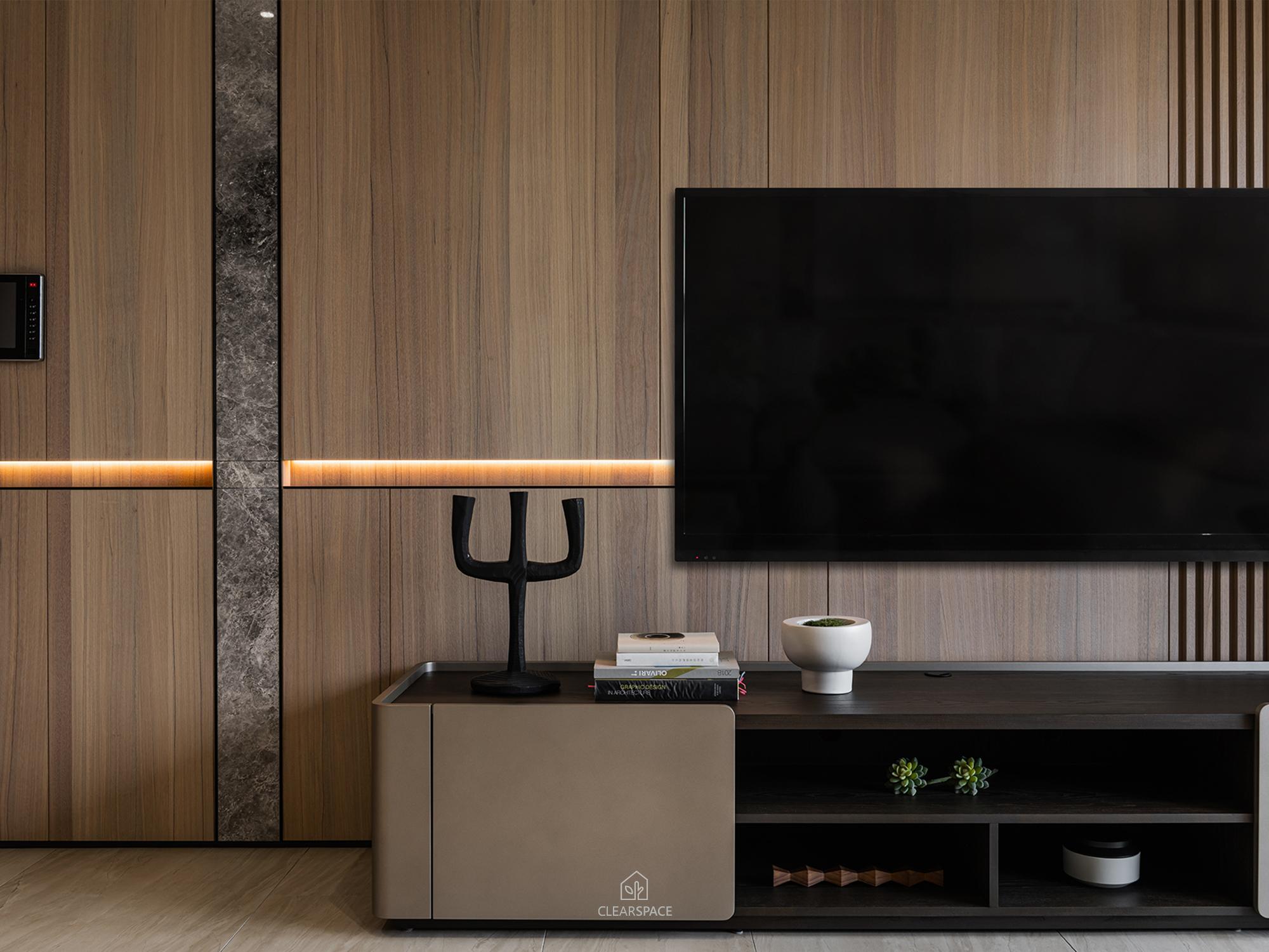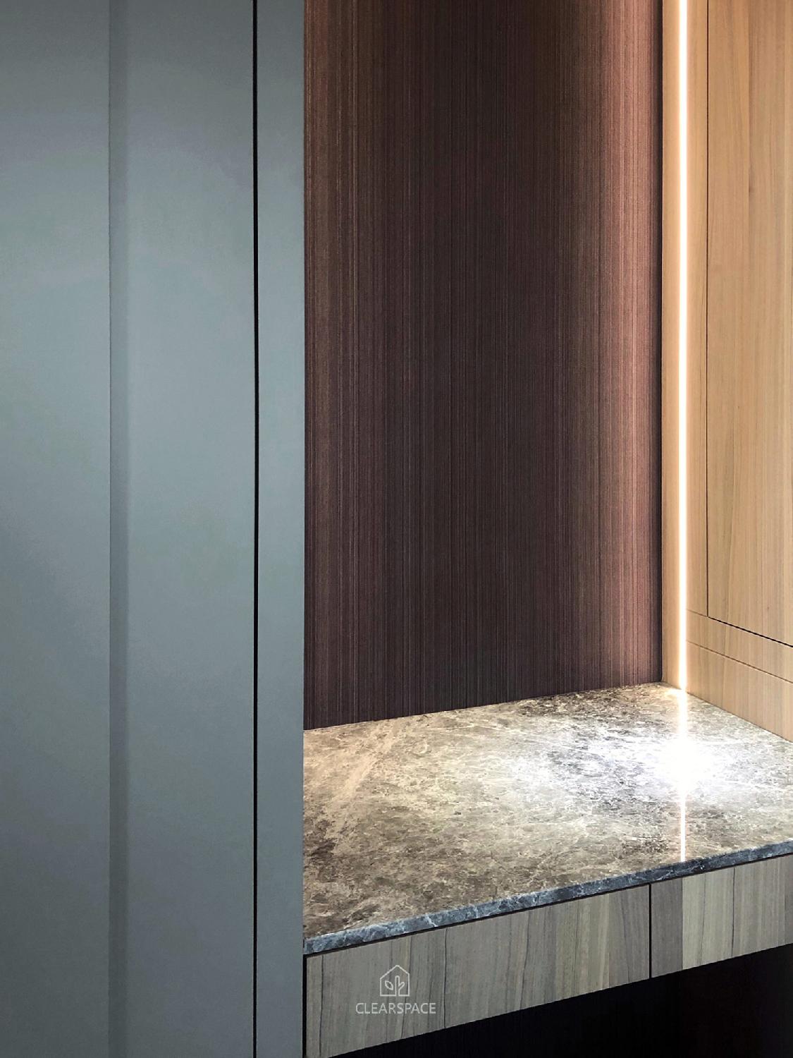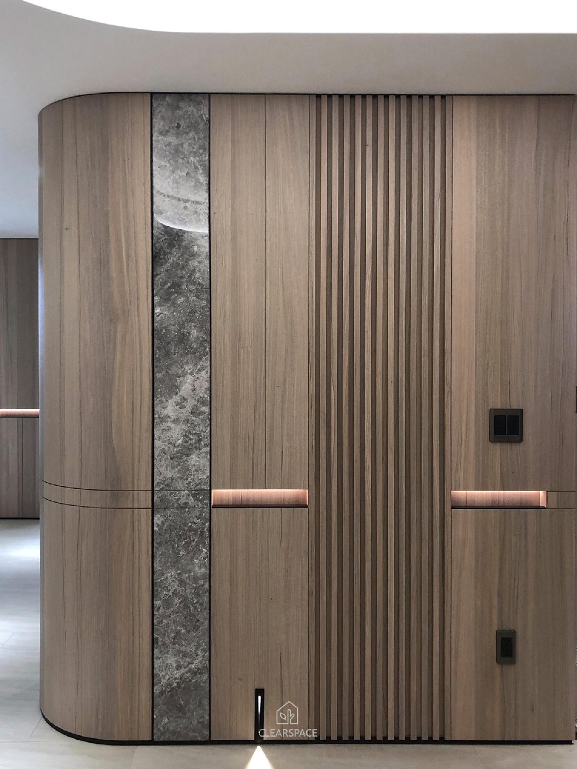 從入口至客餐廳、廚房、臥室、更衣室,全室及腰間接光燈帶+壁面隱藏堅固扶手,住家安全升級。全曲壁面收納櫃,美觀、機能、舒適又安全。
