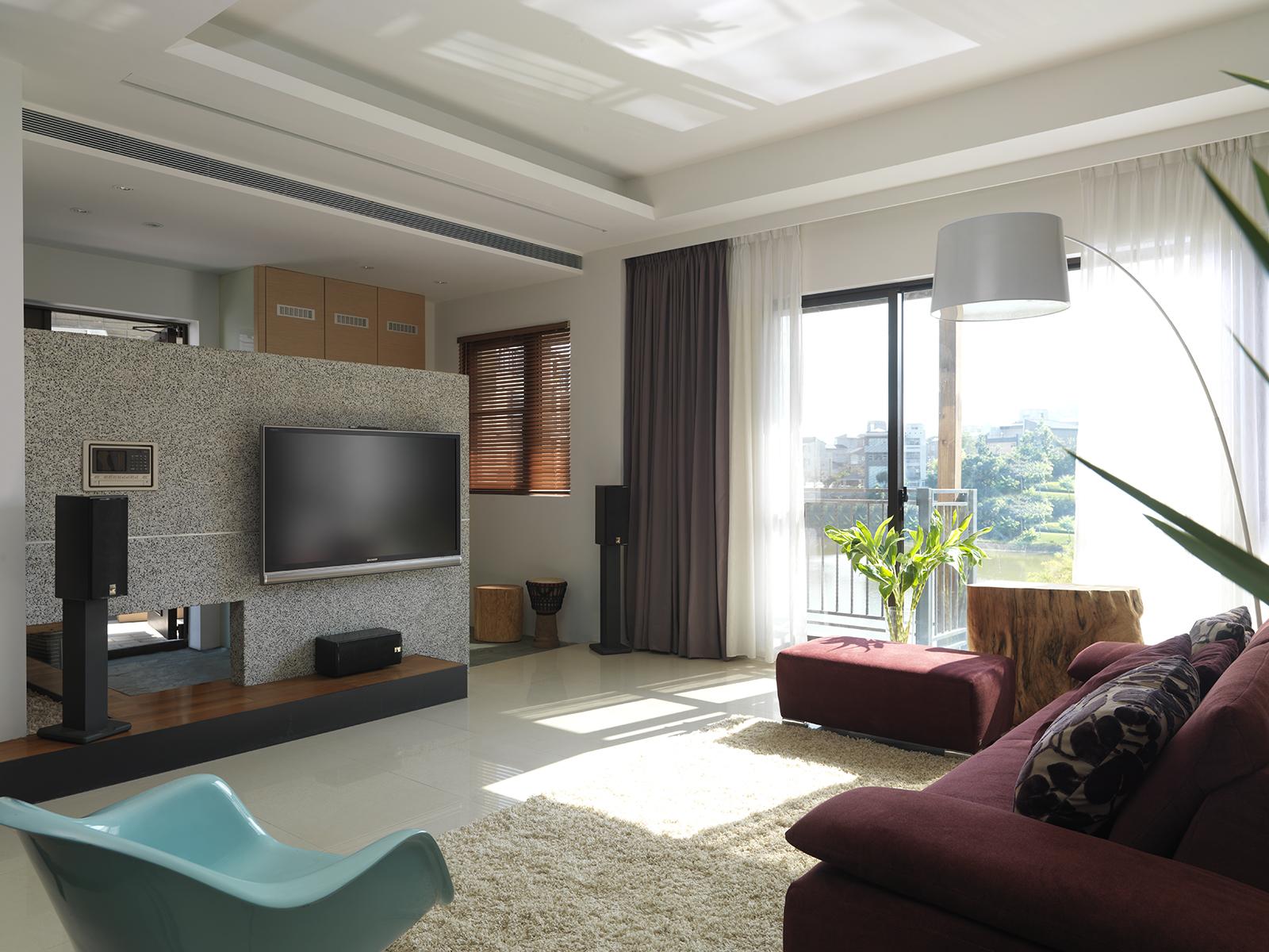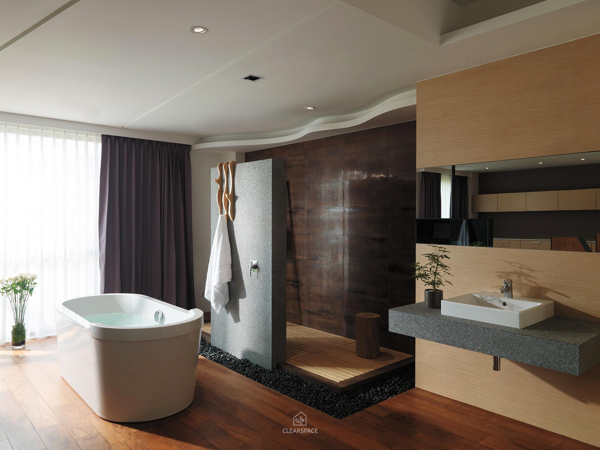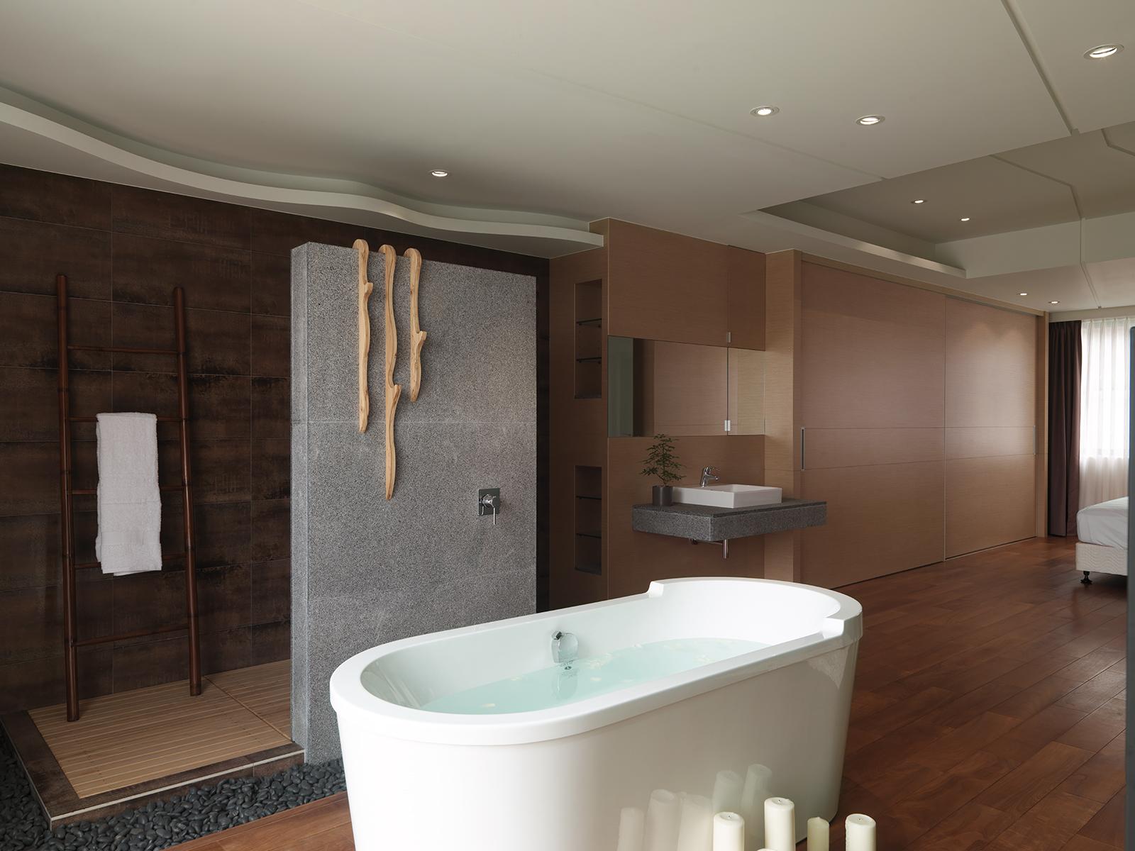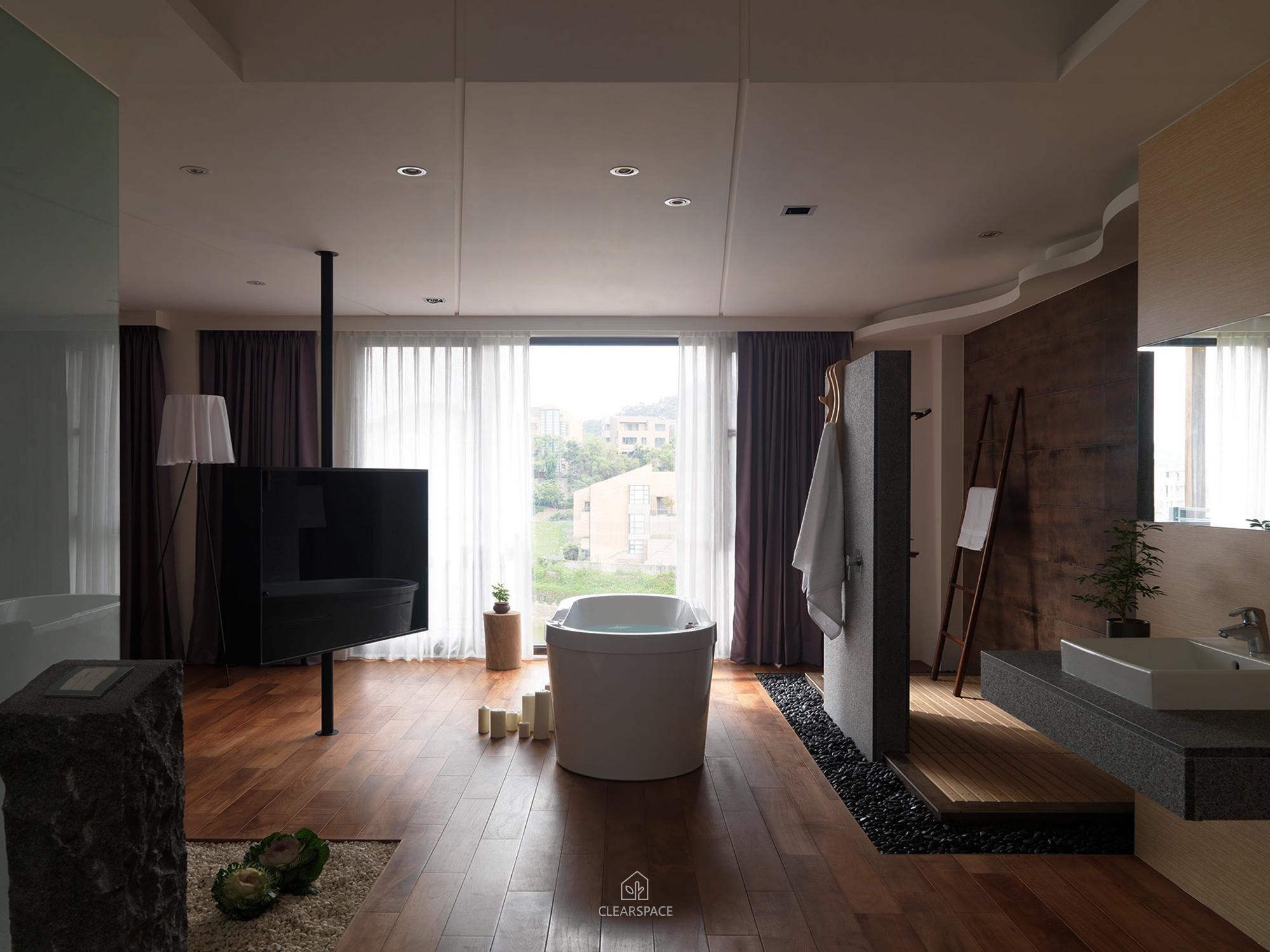 在室內面積26坪大小的主臥空間,規劃出臥眠區、淋浴區、泡澡區、蒸氣室區、閱讀區(兼具視聽機能)。整個區域以開放式的手法規劃,設計360度可旋轉的TV,滿足主人的視聽娛樂享受;泡澡區旁的局部石材成為與淋浴區域的介面關係,更引申成為的掛衣區域,具檔水效果;大面積的落地窗,透過智能系統的安排,讓主人在泡澡時也能享受到室外的好風景,不必擔心個人隱私問題。空間中良好的通風特性、暖風機的安排、足夠的面積,解決了衛浴、臥眠區域完全開放規劃下所擔心的潮濕問題,天花運用勾縫線條,延伸向外,輕鬆拉進室外環境綠意。