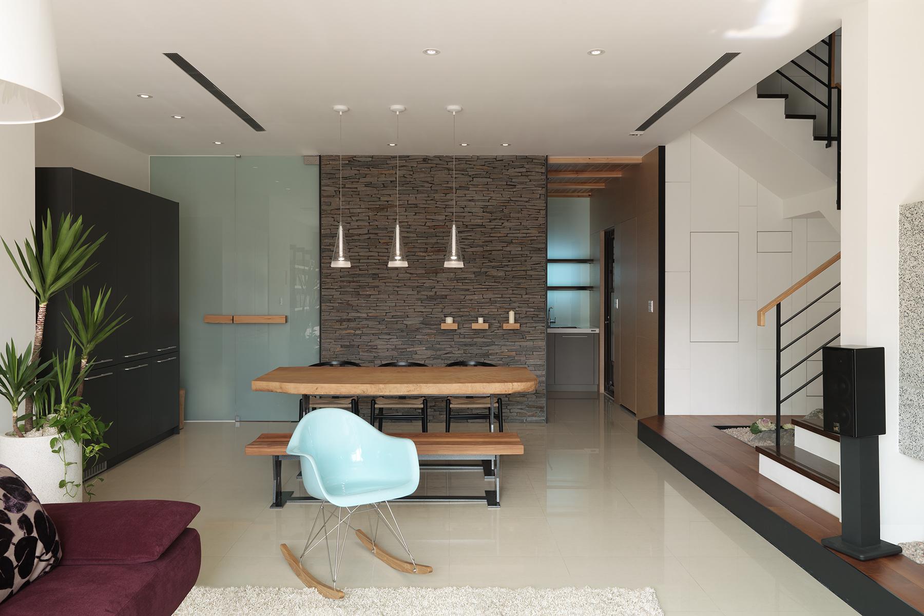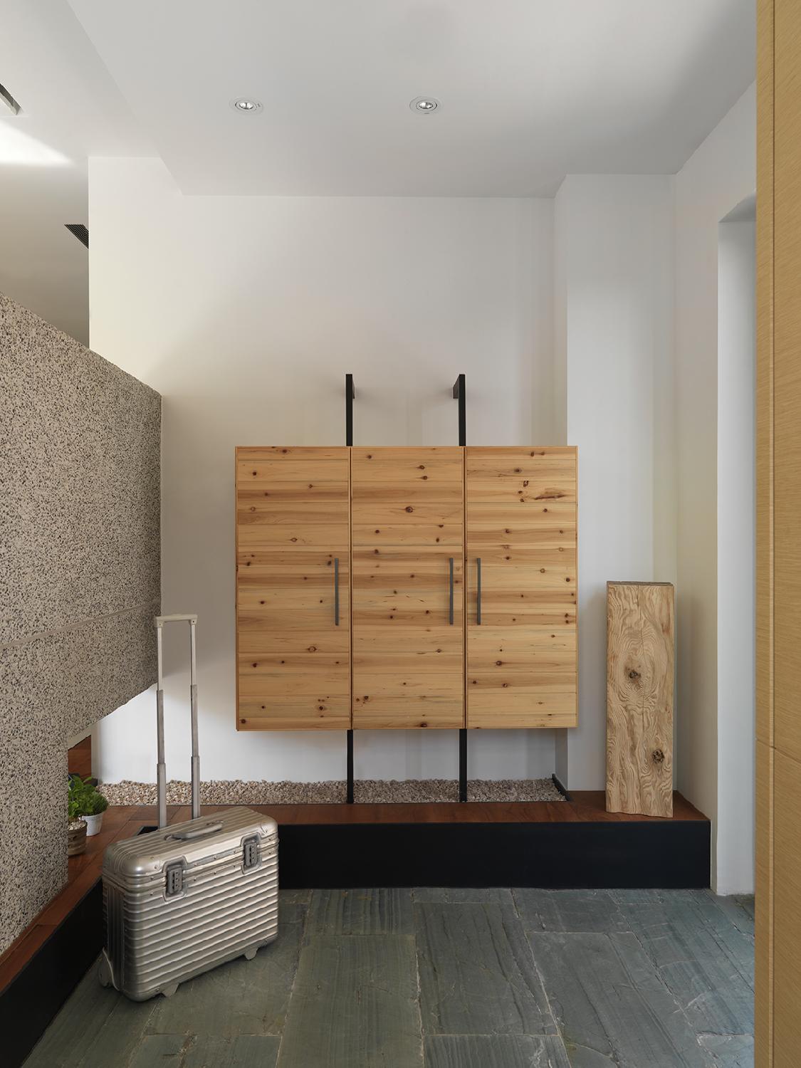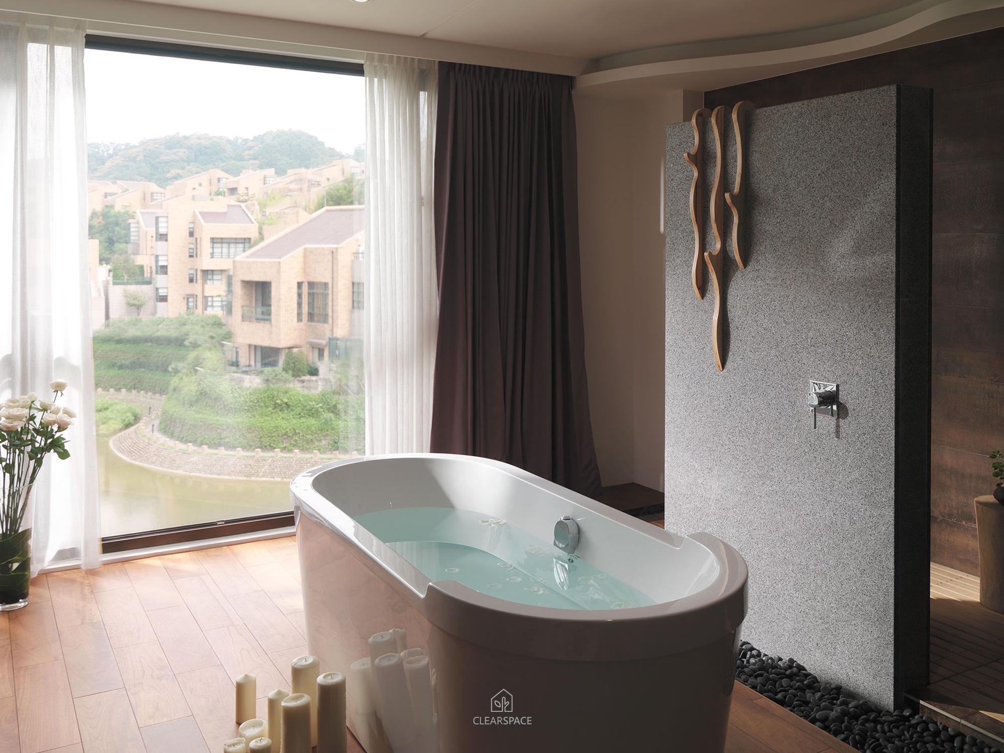 在室內面積26坪大小的主臥空間,規劃出臥眠區、淋浴區、泡澡區、蒸氣室區、閱讀區(兼具視聽機能)。整個區域以開放式的手法規劃,設計360度可旋轉的TV,滿足主人的視聽娛樂享受;泡澡區旁的局部石材成為與淋浴區域的介面關係,更引申成為的掛衣區域,具檔水效果;大面積的落地窗,透過智能系統的安排,讓主人在泡澡時也能享受到室外的好風景,不必擔心個人隱私問題。空間中良好的通風特性、暖風機的安排、足夠的面積,解決了衛浴、臥眠區域完全開放規劃下所擔心的潮濕問題,天花運用勾縫線條,延伸向外,輕鬆拉進室外環境綠意。