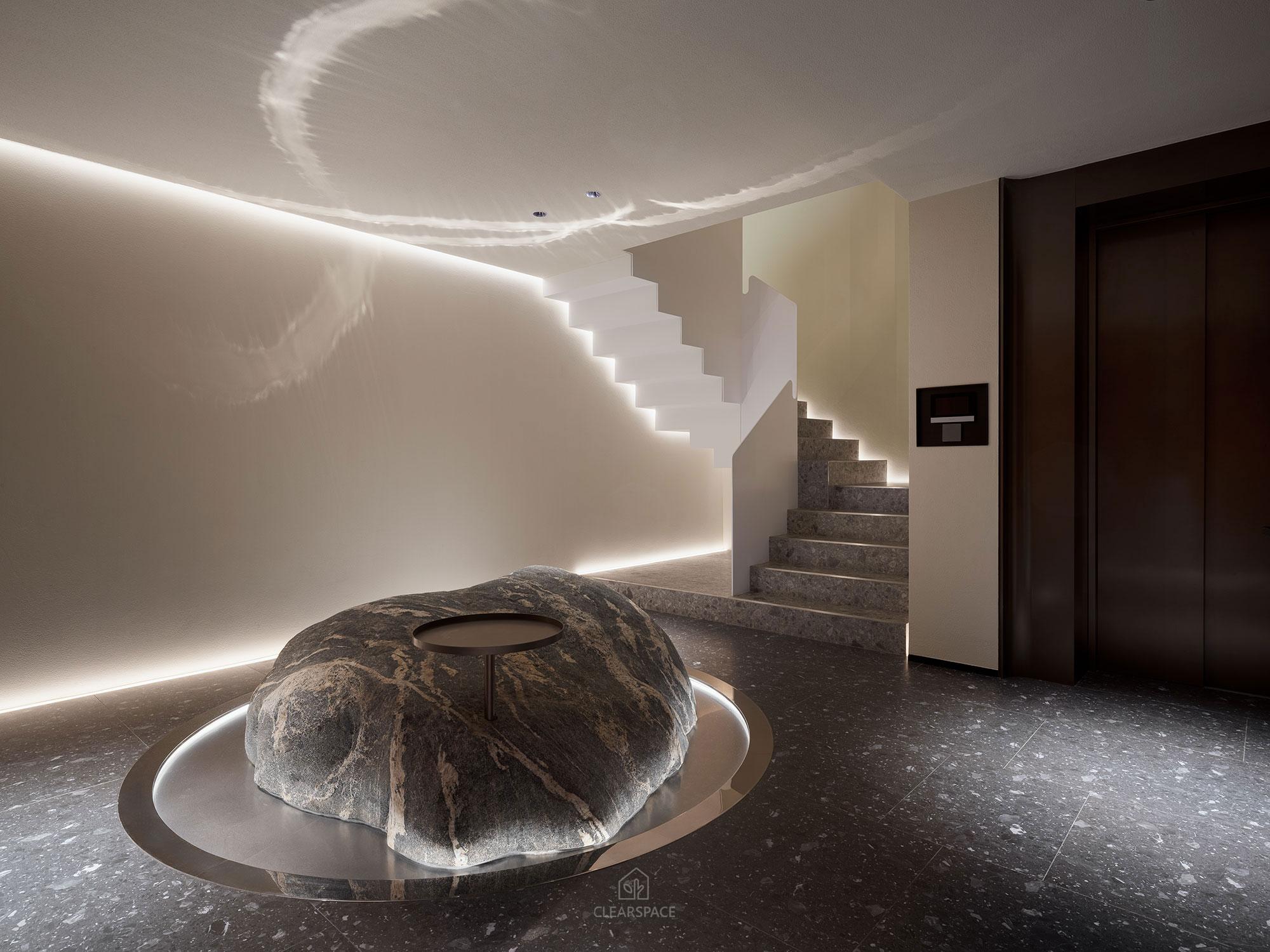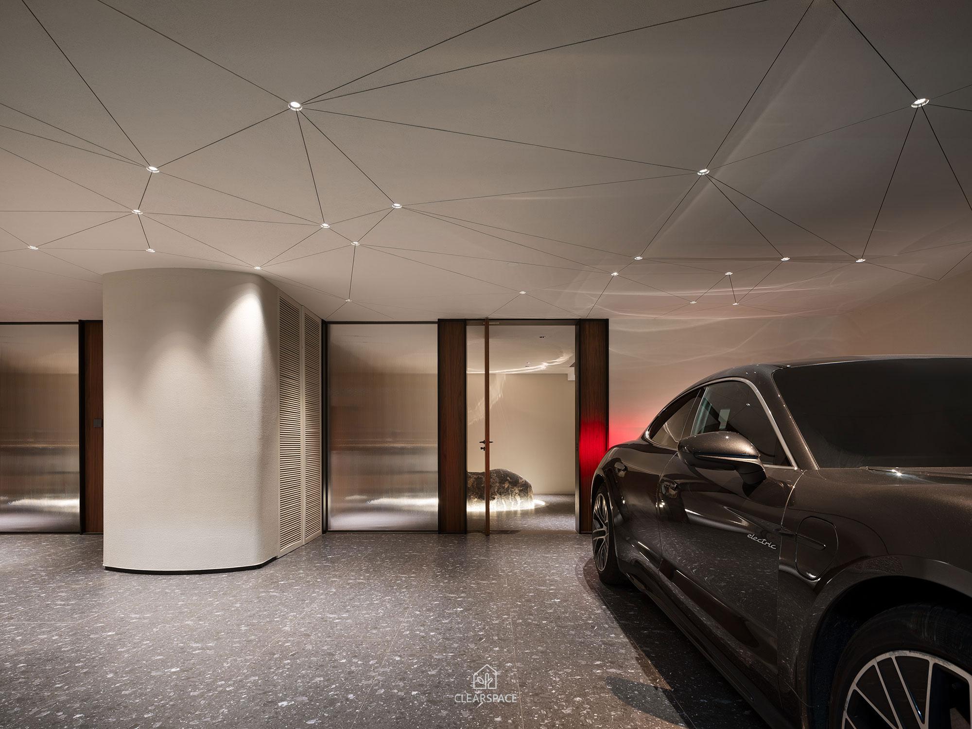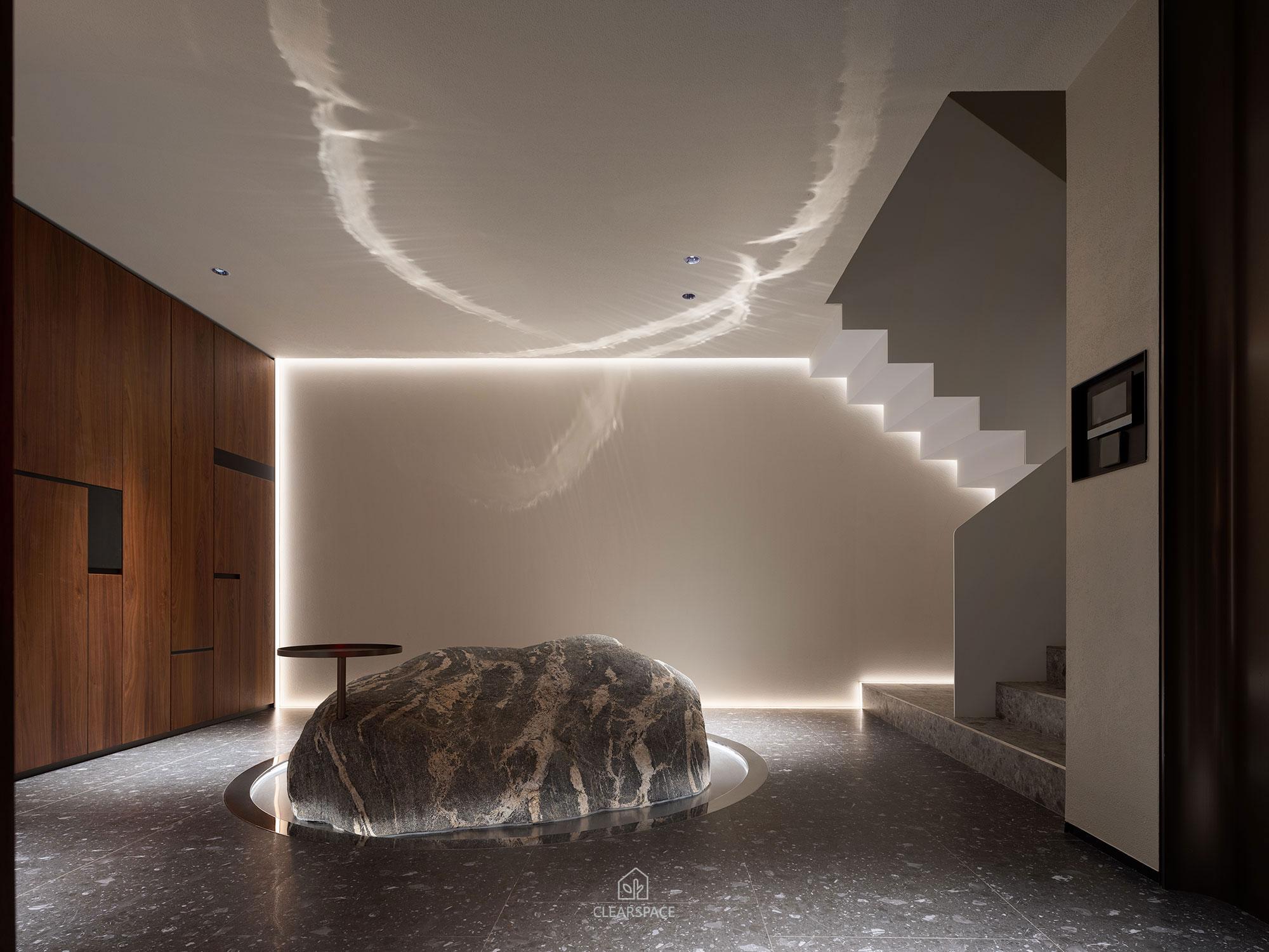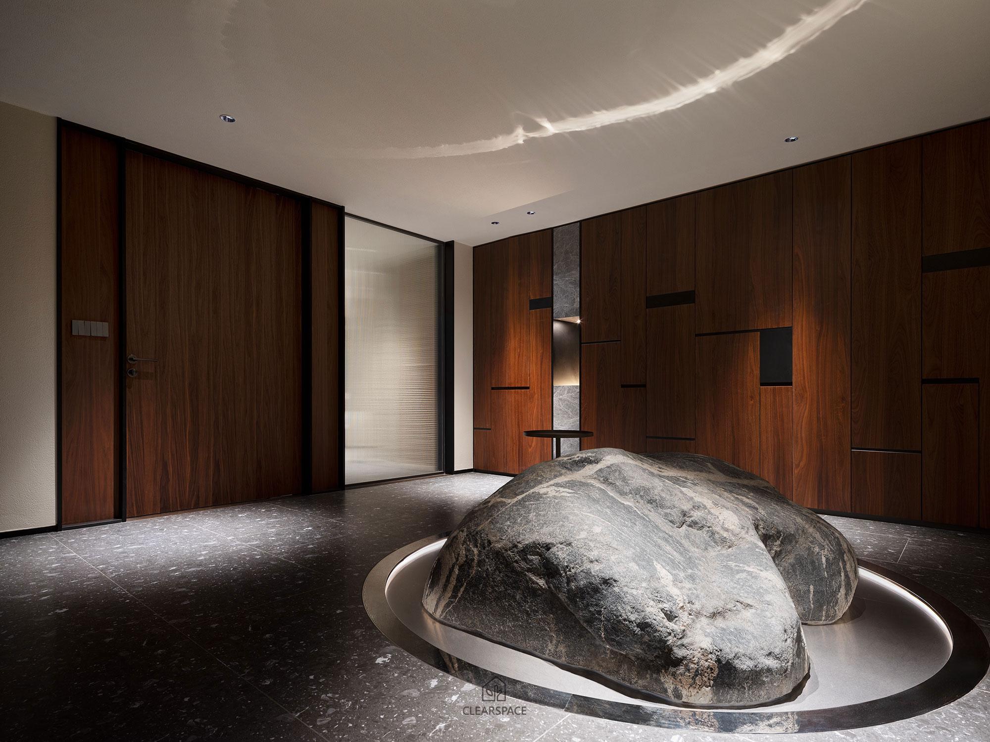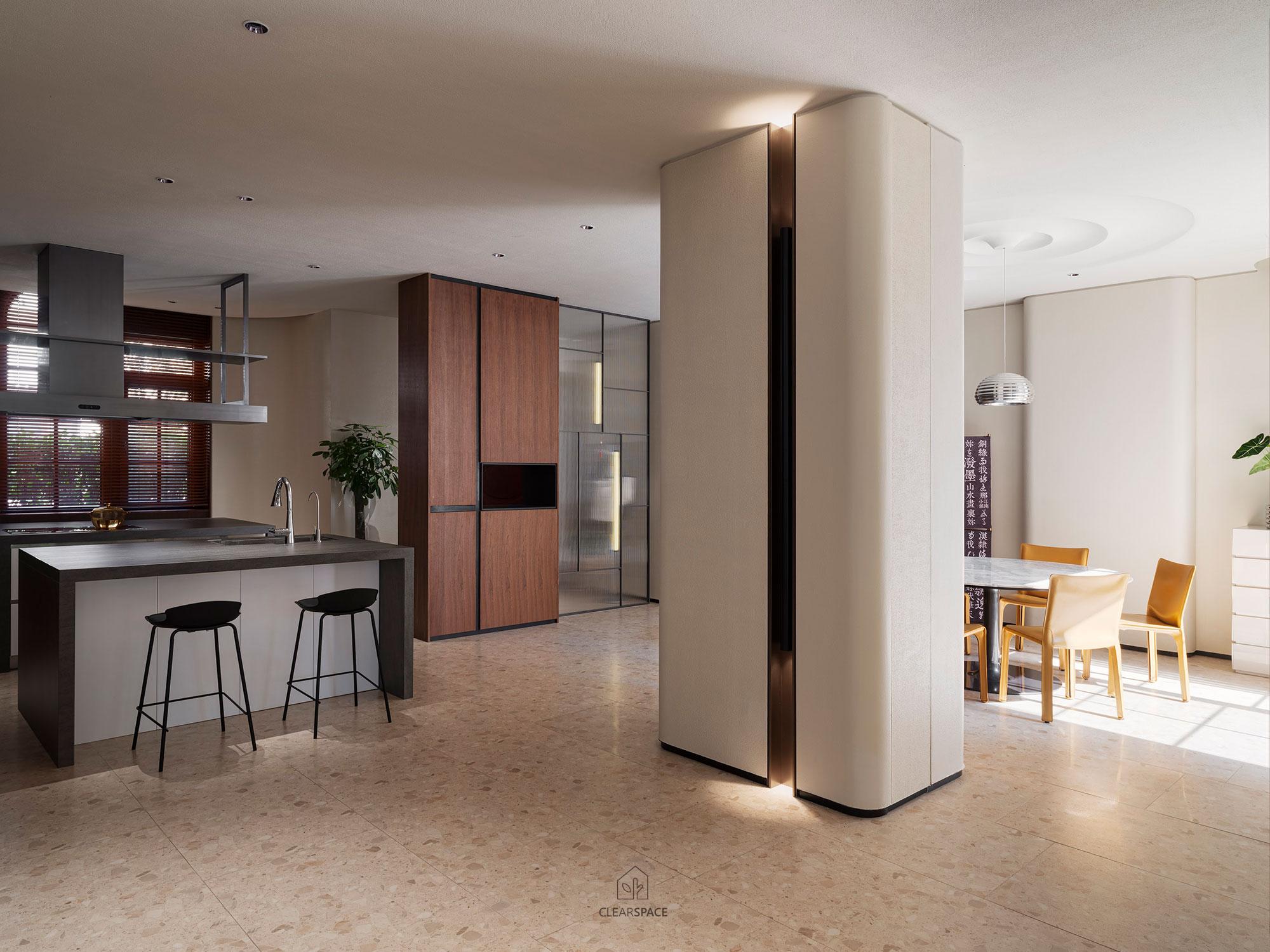 本住宅室內設計以「現代洞窟」為隱喻,重新詮釋「家」的本質~一個和平歸屬與心靈安放的居所、靜謐包覆的空間,讓人感受到被保護被滋養,並在情感上獲得安定與歸屬感。設計概念源自業主家族鋼鐵工廠常見的地下採掘洞窟形態,以「來自土地的庇護」為起點,轉化為具象空間語言。靈感來自自然地貌之極簡柔和曲線、溫潤質感與低彩色調,格局以鑽石型配置,象徵如鋼鐵般的堅毅永恆,營造出不只觸動視覺更觸動心靈的生活場域。